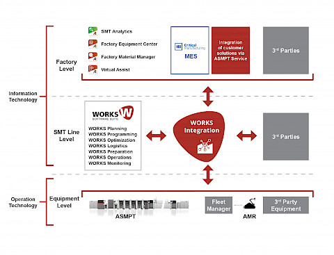 WORKS Integration: nahtlose Integration aller Hard- und Softwarelösungen von ASMPT SMT Solutions mit problemloser Anbindung von Drittanbietersystemen.