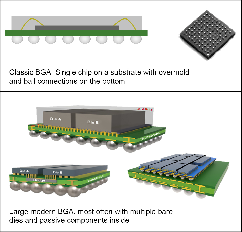 BGA packages range from compact, simple designs to highly complex variants with large form factors and lots of solder balls.
