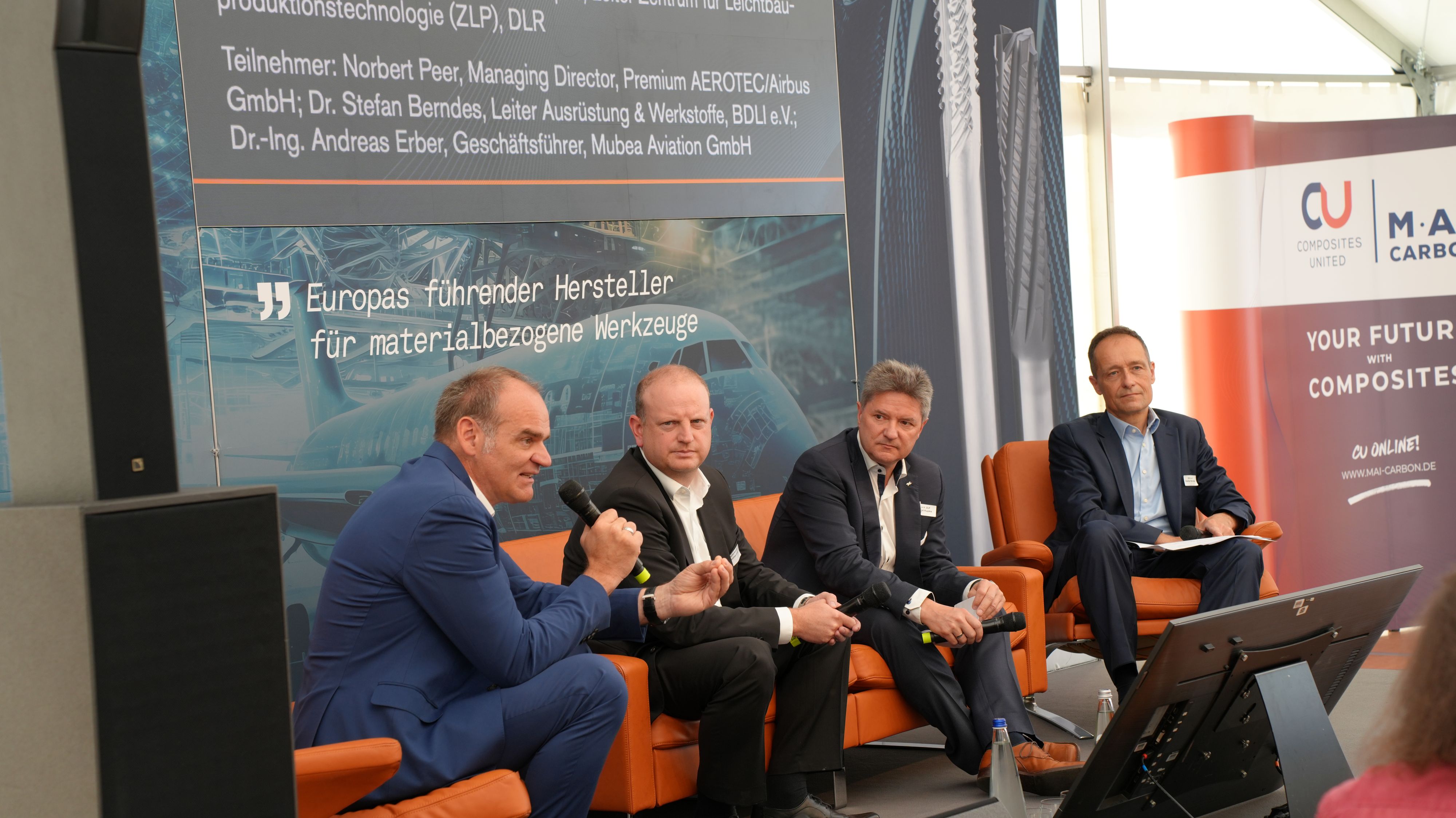 Podiumsdiskussion: Norbert Peer, Managing Director von AIRBUS Aerostructures, Dr.-Ing. Andreas Erber, Geschäftsführer der Mubea Aviation GmbH, Prof. Dr.-Ing. Michael Kupke, Stellvertretender Institutsdirektor, Deutsches Zentrum für Luft- und Raumfahrt (DLR), Institut für Bauweisen- und Strukturtechnologie, Dr. Stefan Berndes, Leiter Ausrüstung & Werkstoffe, Bundesverband der Deutschen Luft- und Raumfahrtindustrie e. V. (v. l. n. r.)