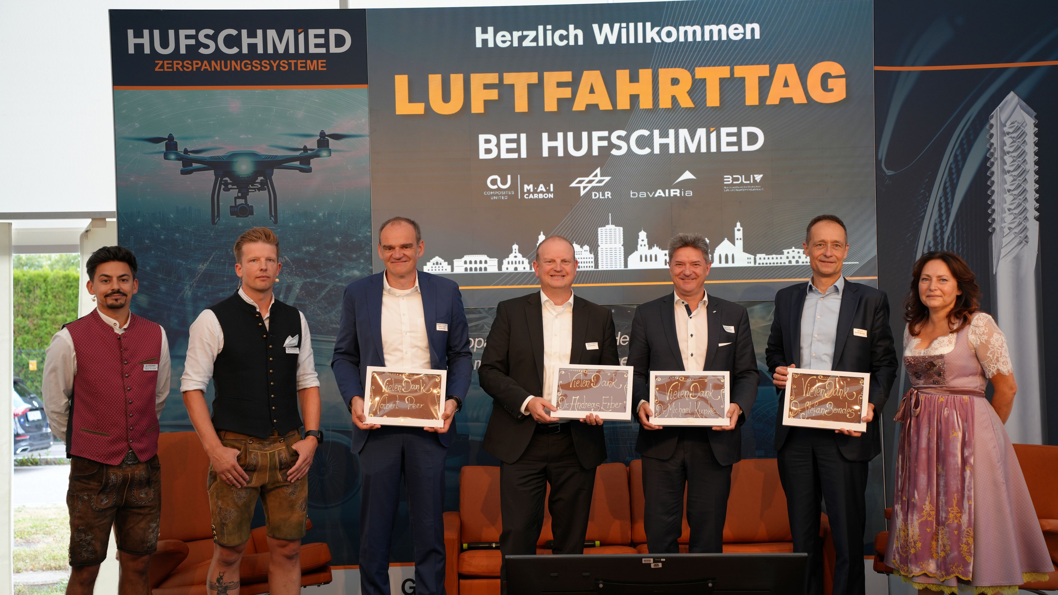 Patrick Pulendran und Mathis Toppmöller, zwei Business Development Manager bei Hufschmied und Organisatoren des Luftfahrtags, Norbert Peer, Managing Director von AIRBUS Aerostructures, Dr.-Ing. Andreas Erber, Geschäftsführer der Mubea Aviation GmbH, Prof. Dr.-Ing. Michael Kupke, Stellvertretender Institutsdirektor, Deutsches Zentrum für Luft- und Raumfahrt (DLR), Institut für Bauweisen- und Strukturtechnologie, Dr. Stefan Berndes, Leiter Ausrüstung & Werkstoffe, Bundesverband der Deutschen Luft- und Raumfahrtindustrie e. V., Christel Hufschmied, Geschäftsführerin der Hufschmied Zerspanungssysteme GmbH