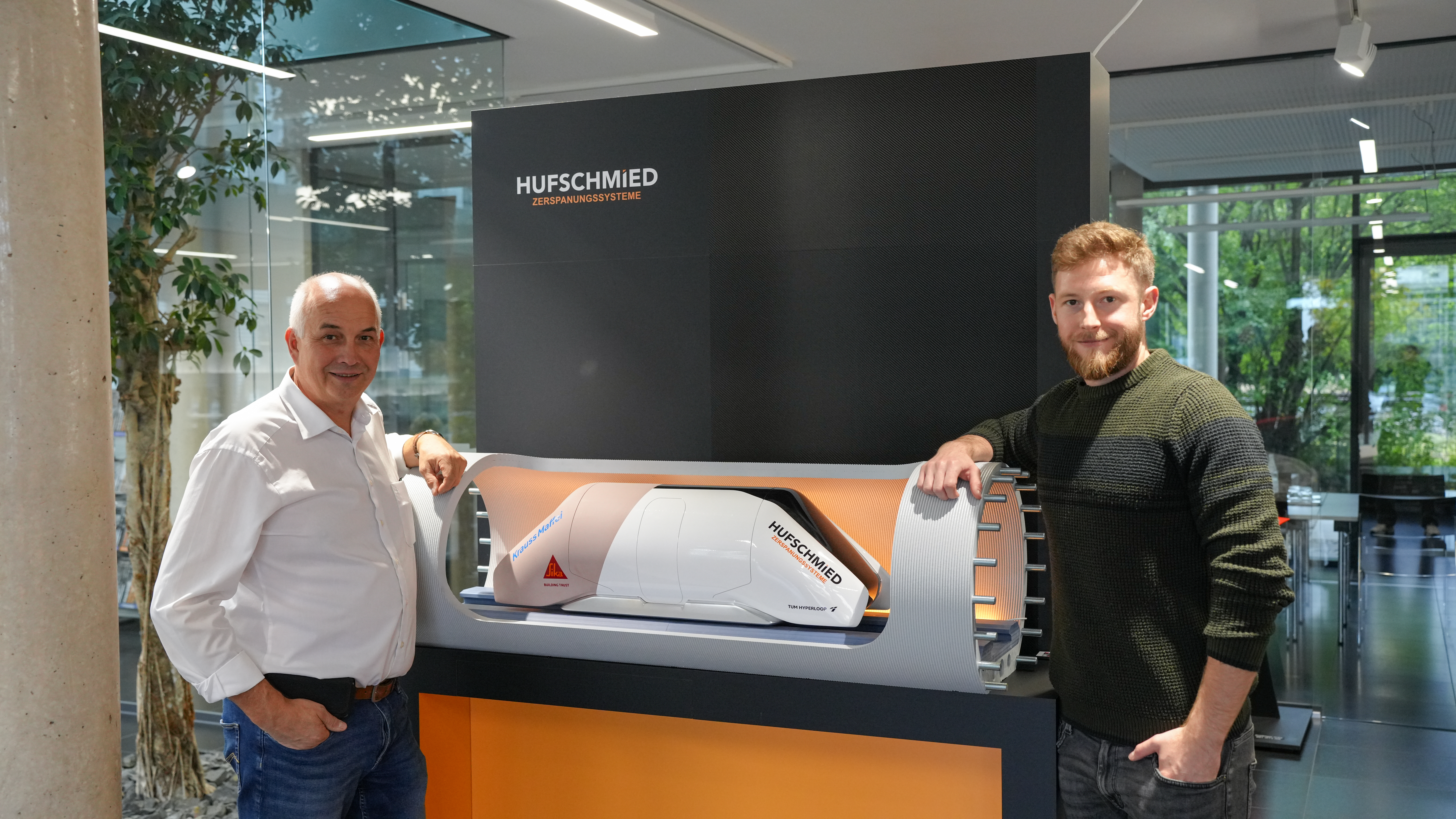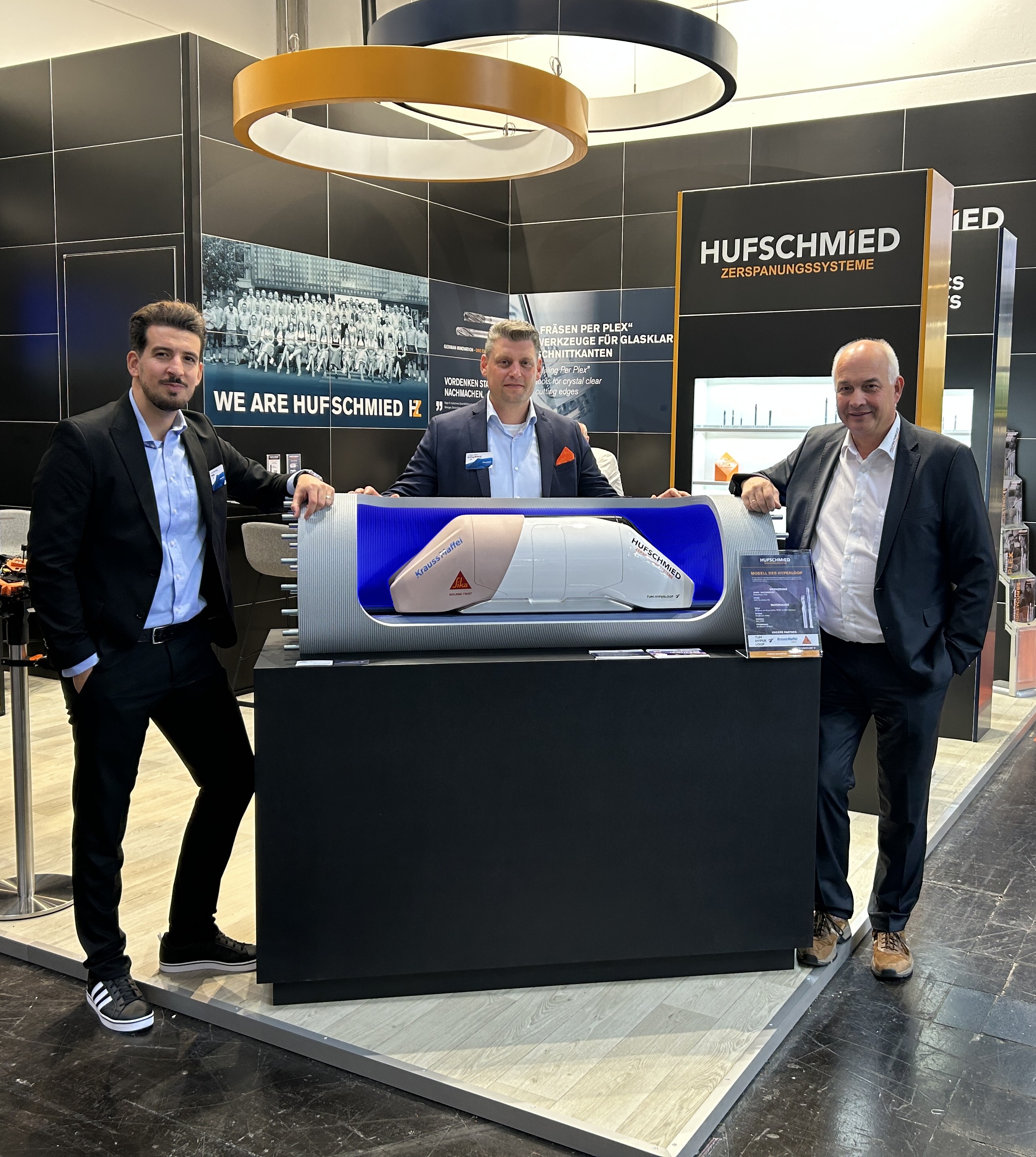 Ender Murat Ferat, Product Manager Additive Manufacturing, and Kristijan Mikic, Expert Sales Manager Additive Manufacturing at KraussMaffei, together with Wolfgang Rinke, Business Development at Hufschmied, and the Hyperloop model at the “K” plastics trade fair in Düsseldorf (from left to right).