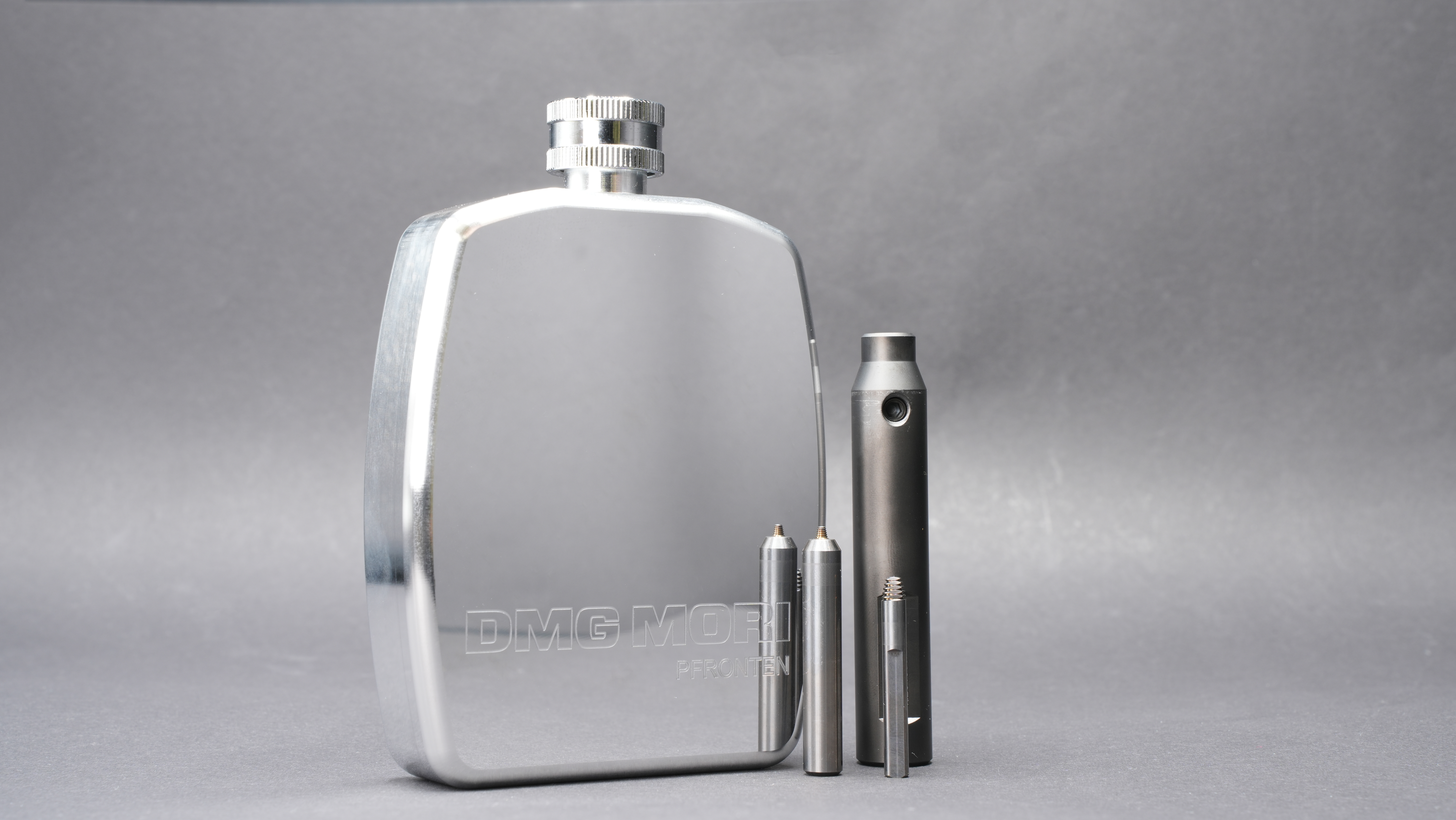 Ein aus zwei Komponenten zusammengeschweißter Aluminium-Flachmann war das Beispielwerkstück, mit dem DMG MORI den Einsatz der FSW-Werkzeuge von Hufschmied bei seiner Hausausstellung anschaulich machte.