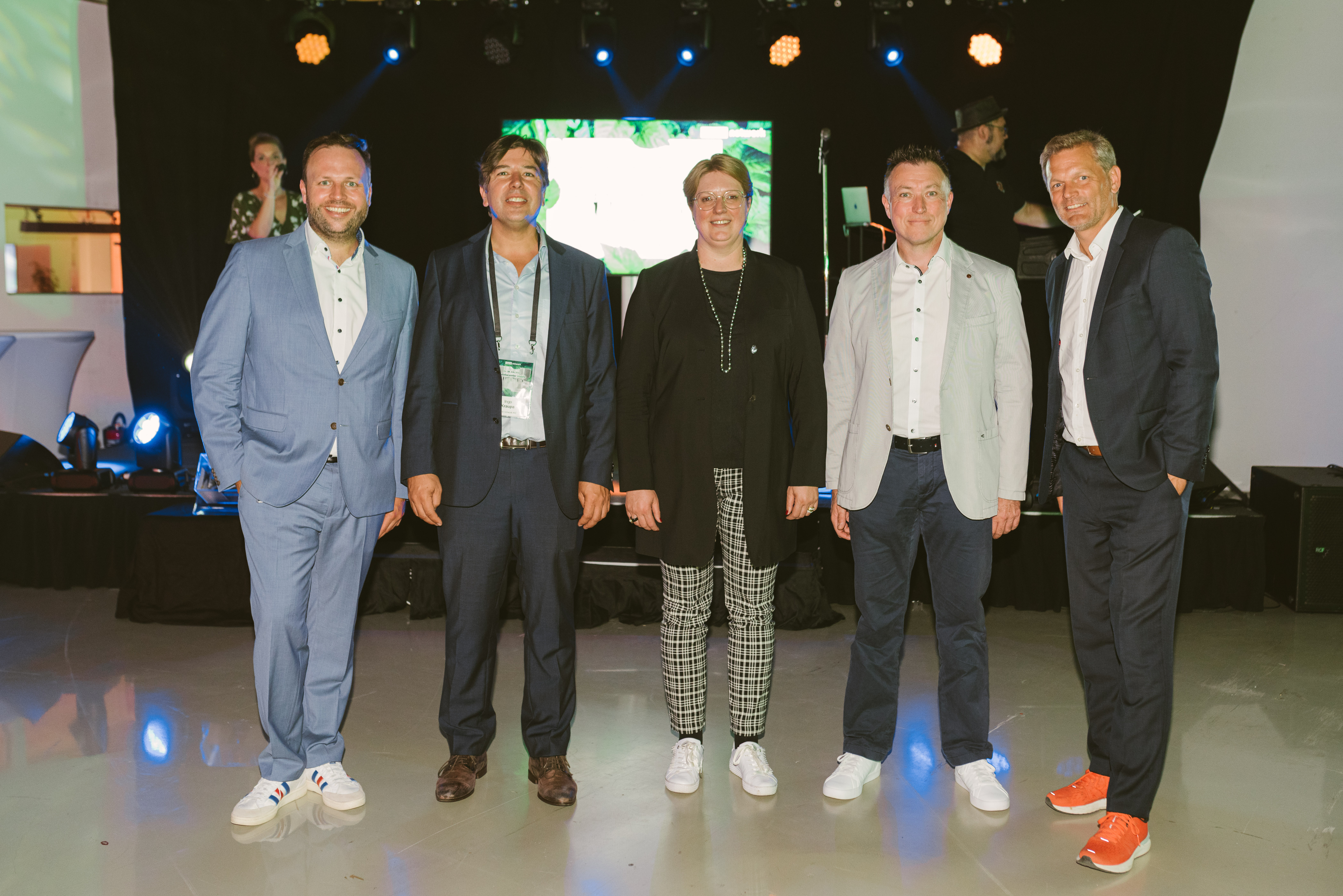 Die Vorstände Ingo Kraupa, CEO (Mitte) und Florian Sippel, COO (links) begrüßen die Gäste. Mit auf dem Bild Moderator Tom Meiler (rechts).