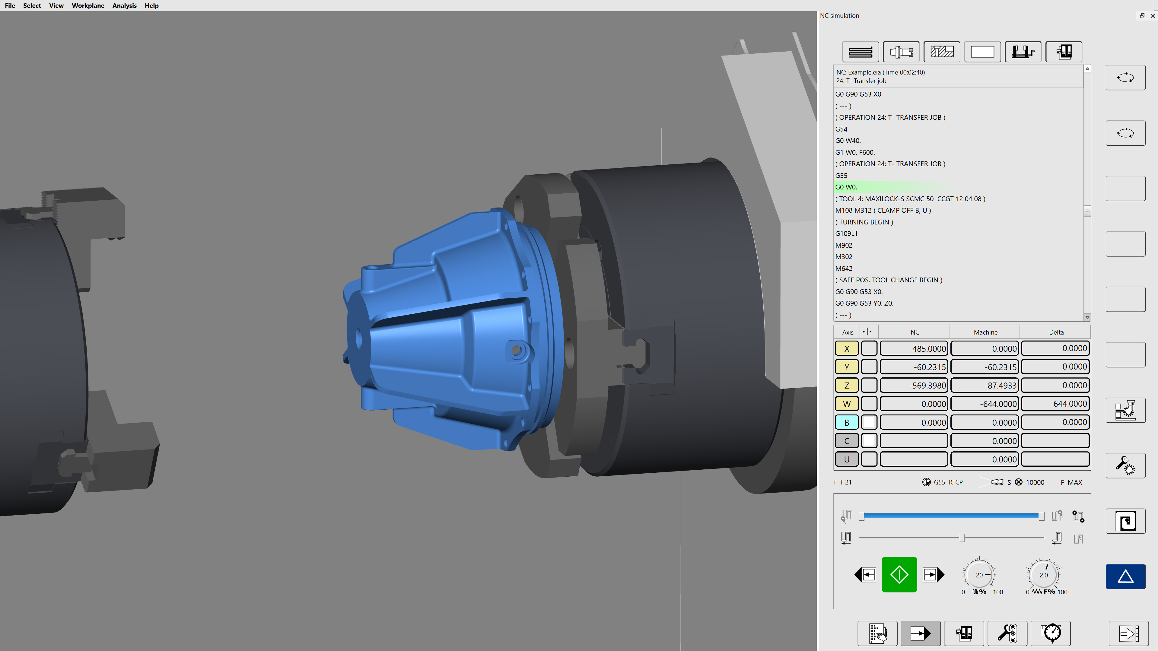 New in hyperMILL® VIRTUAL Machining: Simulation of part transfer on a machine with main and counter spindles and a milling head.