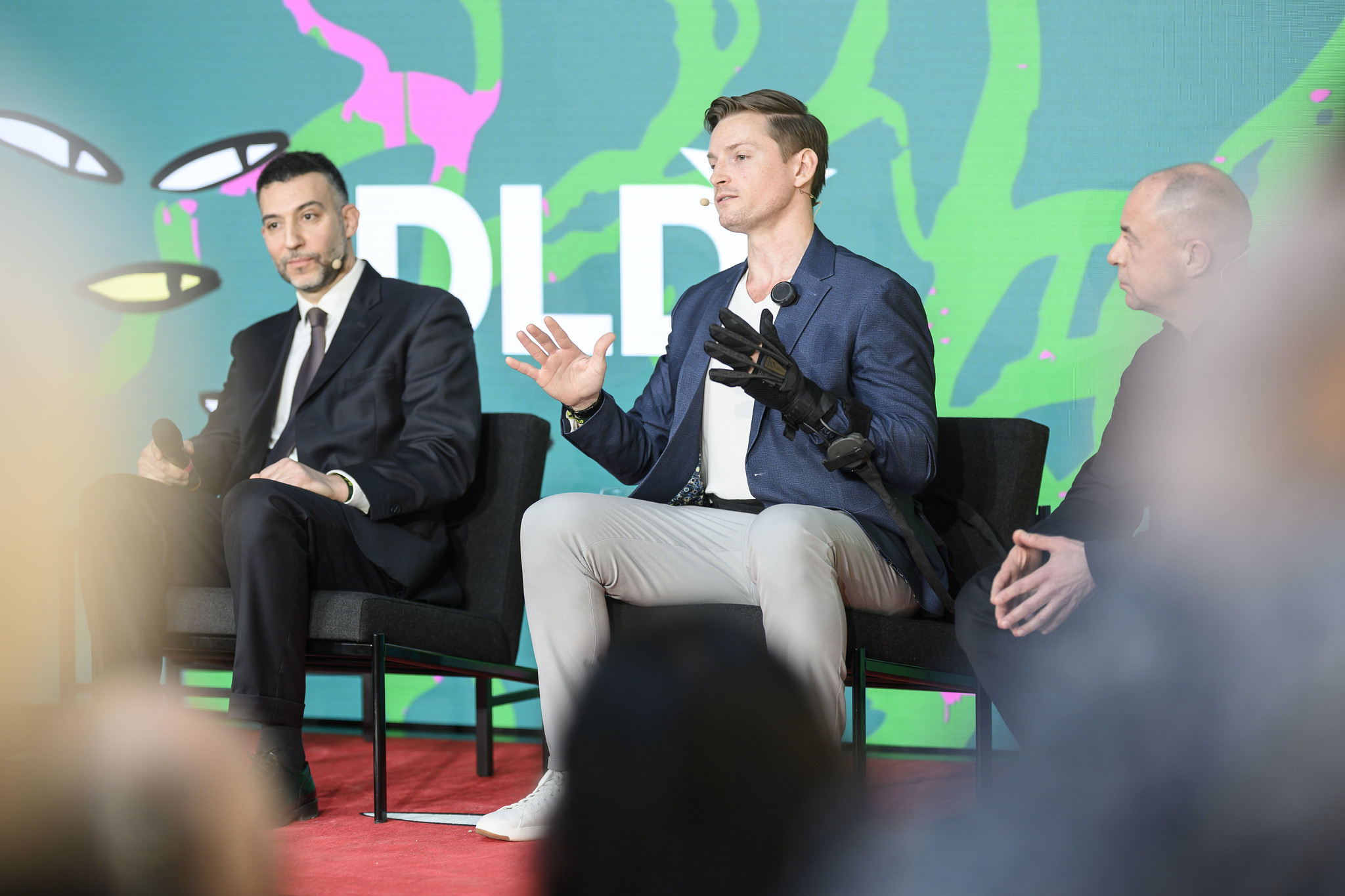 DLD Munich 2026, Health Tech: Discussion about the MotionMate active hand orthosis with Alexander Gerfer, CTO at Würth Elektronik eiSos Group (right), Ryan Alicea, Co-founder & CEO, Powered Orthotics, (center), and Prof. Dr. Lorenzo Masia, Professor of Intelligent Bio-Robotic Systems at the Technical University of Munich (left).